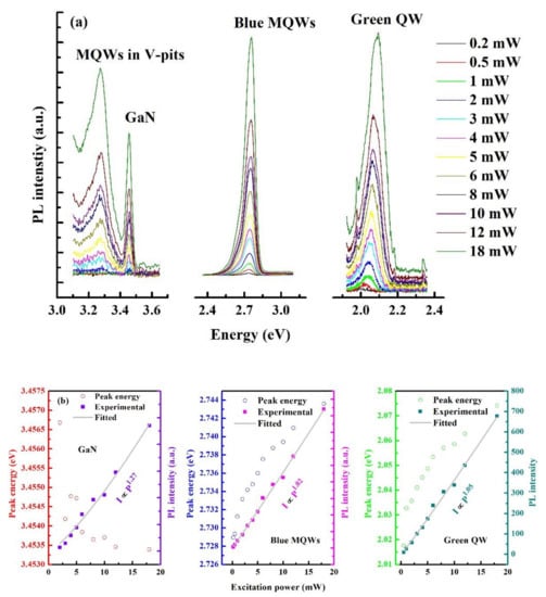 To investigate the optical performance of the as-grown sample, the excitation power-dependent PL was carried out at 90 K. The excitation power was changed from 0.2 mW to 18 mW by a neutral optical attenuator. The emission peaks for GaN, blue MQWs and the green QW are clearly discernable from the spectra (Figure 3a). The other peak locates at ~3.27 eV, which is between the GaN (3.45 eV) and blue MQWs (2.75 eV), and should be attributed to the emission from the MQWs on the sidewall of V-pits. As shown in Figure 2c,d, the MQWs on the sidewall of V-pits are more than half thinner than the normal MQWs; therefore, the emission peak should demonstrate a large blue-shift. Moreover, as the sidewalls of V-pits are semi-polar planes, where the indium incorporation efficiency is lower than the c-plane, the blue-shift of the emission peak will be exacerbated further, thus leading to the additional emission peak between GaN and blue MQWs [9,27]. The peaks are fitted by a Gaussian function, and the peak energies as well as the PL integral intensity for each peak are represented in Figure 3b. It is worth noting that the emission peak of GaN exhibits a red-shift as the excitation power increases, while the emission peaks for blue MQWs and the green QW are monotonously blue-shift. The red-shift for the GaN emission peak should be attributed to the bandgap shrinkage due to the heating effect introduced by the high excitation power. Furthermore, the blue-shift for blue MQWs and green QW should be due to the band filling effect. A higher excitation power will excite the photogenerated carriers to populate the higher energy bands, thus leading to a blue-shift of the emission peak. The carrier transport from barrier to well may also contribute to the blue-shift as suggested by Lu et al. in that the excitation source is within the nonresonant excitation regime [29]. The PL integral intensity changing with excitation power obeys a power law function, viz. , where I is the PL integral intensity, P is the excitation power and m is the index [18,30,31]. The fitted results are demonstrated in Figure 3b. The index m of GaN is 1.27, which is larger than 1, indicating a Shockley–Read–Hall (SRH)-dominant recombination [30]. In addition, the m indices for blue MQWs and green QW are almost equal to 1, indicating the radiative recombination process is dominant, which benefits the high efficiency light emission [30].