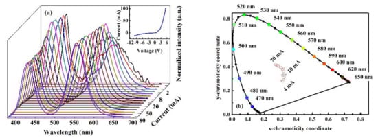 The EL performance of the LED chips is investigated by undergoing different current injections. The EL spectra from 0.5 mA to 80 mA are illustrated in Figure 5a, with the intensity normalized to the highest peak value for each spectrum. From Figure 5a, one could easily distinguish two emission peaks (i.e., the blue peak ~430 nm and the green peak ~568 nm) with comparable intensities. The peak intensity of the blue emission is a little stronger when the current is lower than 6 mA, while the green peak gradually surpasses the blue one as the current increases. Such a phenomenon should be attributed to the facilitation of deep hole injection assisted by the large V-pits, as shown in Figure 2c,d. The V-pits make the current bypass the top QWs and directly inject into the deeper QWs [33,34]. With the ascending current, the bypass effect is weakened, hence leading to the enhancement of the top QWs’ emission, i.e., the green emission. The inset in Figure 5a shows the I-V curve for an LED chip, where the forward voltage at 20 mA is 2.85 V. The chromaticity coordinates (x, y) in the CIE1931 chromaticity diagram as well as the CRI and CCT at different injection currents are listed in Table 3. The (x, y) coordinates are also delineated in Figure 5b, showing a circumvention around the white light location. The CIE (x, y) coordinates corroborate the white light emission of the LED under different currents [17]. In addition, the CRI and CCT are also important indicators to evaluate the quality of the white light. A higher CRI value indicates a better color rendering property of the white light. In other words, the white light spectrum is closer to the sunlight or blackbody radiator. The CRI values based on eight reference objects (Ra) at different currents are calculated from the EL spectra. As the CCT values are all above 5000 K, a daylight illuminant is used in the CRI calculation [35]. The CRI value reaches 60 when the injection current is 1 mA with the CCT of 6426 K. It is a high value in the dual-wavelength white light emissions, as a high CRI value usually needs RGB three emissions. Only two emission peaks (i.e., blue and green) with the lack of red emission have the intrinsic drawback for realizing high CRI values. However, if we add a red emission QW into the active region, assisted by tuning the injection current, a CRI value larger than 90 should be anticipated, which should be investigated in the future.