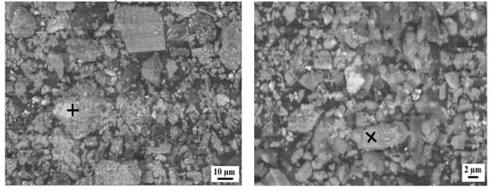 Table 1 also shows the chemical composition of the materials (i.e., coal ash, cement, and quarry dust) used in the production of the bricks. The main constituents of the cement were calcium oxide (61.47%), silica oxide (19.06%), aluminum oxide (5.68%), and iron oxide (4.34%) with other alkalis, with a loss on ignition of 3.24%. The coal ash was composed of oxides of silica (61.5%), alumina (10.3%), and calcium oxide (6.08%). The total sum of the silica and alumina in the coal ash was greater than 70% and can be classified as Class F fly ash, as per ASTM C618 (ASTM C618, 2019). Higher amounts of oxides in the coal ash from power plants were in agreement with previous studies [,]. Various other limits of ASTM C618 were also satisfied. For instance, a percentage of CaO is also less than 18%, as specified in the ASTM standards. The loss on ignition (LOI) of used coal ash was 10.39. A greater amount of loss on ignition in the coal ash has already been reported in other studies [,]. The higher loss on ignition in coal ash will result in a higher demand for water for targeted workability, leading to decreased compressive strength due to the unburnt elements []. Moreover, a higher LOI will lead to discoloration of the brick specimen. The chemical composition of sand used for the production of brick indicates that it has a greater amount of silica oxide (91.7%), with a lesser LOI (1.94%). The quarry dust was composed of oxides of calcium (42.84%), silica (9.7%), magnesium (2%), and aluminum (1.72%), with an LOI of 38.41%, which indicates the higher number of unburnt particles that are present in quarry dust.