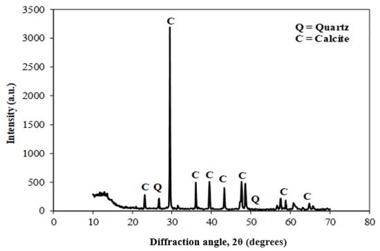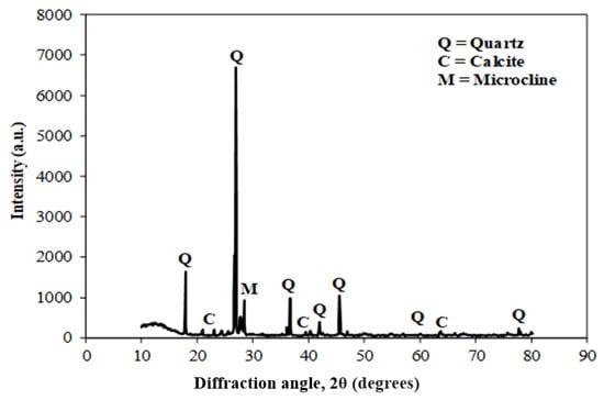 Figure 3 shows the scanning electron microscope (SEM) images of coal ash (CA). It was observed that the CA particles were of varying sizes and irregular shapes. The SEM image (Figure 4) of quarry dust showed the presence of various sizes of particles with varying shapes. Figure 5 showed the SEM image of sand. The sand grains were observed to comprise irregularly shaped particles. The CA, quarry dust, and sand were examined using X-ray diffraction (XRD) to identify the crystalline components (Figure 6, Figure 7 and Figure 8). The components present in CA constituted quartz, mullite, calcite, and illite. Similarly, the XRD patterns of quarry dust and sand (Figure 7 and Figure 8) showed the presence of both quartz and calcite.