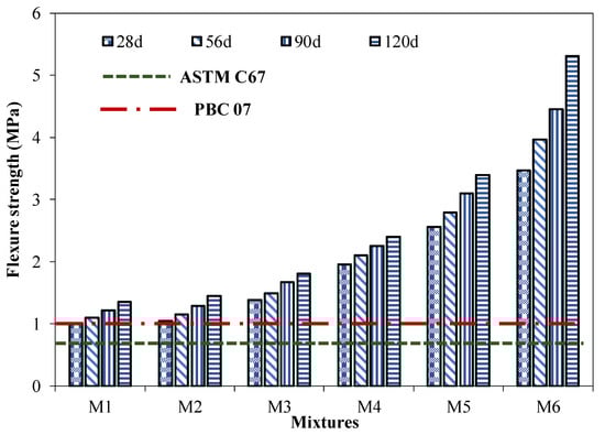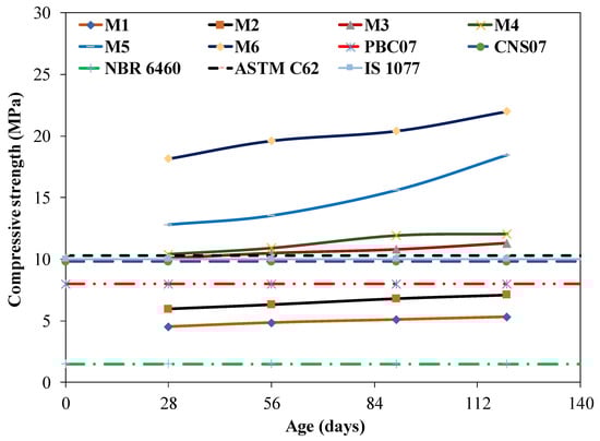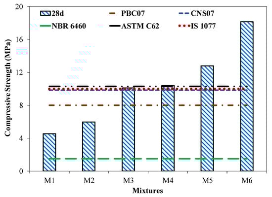 Moreover, the compressive strength behavior of coal ash brick specimens incorporating different quantities of cement content was compared with ASTM C62-13a, 2013 [], Chinese National Standard CNS 382 [], Brazilian Standard NBR 6460 (ABNT 1983a) [], Pakistan Building Code 2007 [], Indian Standard (IS) 1077, 2007 [] and ASTM C55-2017 []. It was observed that, beyond a 15% addition of cement in the brick manufacture, a combination with 45% coal ash (M3, M4, M5, and M6 mixtures) satisfied the standards specifications (CNS 382, PBC 07, NBR 6460, IS 1077, ASTM C62). Indian and Chinese standards were used for the compressive strength comparisons because Pakistan has very similar weathering, climatic, construction, and domestic conditions as those in both countries. The universally accepted ASTM standard was also chosen for comparison.