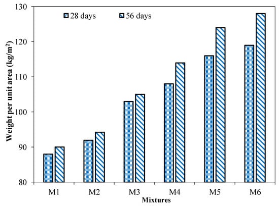 Figure 12 shows the weight per unit area for unburnt bricks incorporating different contents of cement and coal ash. The results revealed that the weight per unit area of brick specimens incorporating different coal ash contents increased with the decrease in the percentage of coal ash. For instance, a 5% and 17% increase in weight per unit area was observed for brick specimens incorporating 50% (M5) and 45% (M4) coal ash contents compared to coal ash bricks with 55% (M6) coal ash content. It may be attributable to the high specific gravity of cement (3.14) compared to coal ash (2.38). This increase in weight per unit area of the brick specimens incorporating cement contents of 15% and beyond (M3, M4, M5, and M6) was still comparable with burnt clay bricks. The results conform to previous research. Abbas et al. reported around an 18% reduction in weight per unit area of bricks incorporating 25% waste fly ash []. This was also noticeable in the results of previous research that the incorporation of porous material in clay or concrete masonry resulted in more lightweight bricks [,]. Moreover, around a 4% reduction in the unit weight of bricks incorporating 15% rice husk ash was also reported []. It can be observed that the incorporation of porous material in bricks leads to the development of more lightweight bricks [,,].