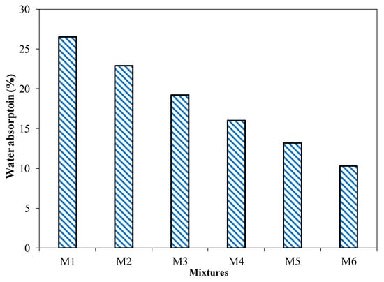 Figure 13 shows the water absorption rates of brick specimens incorporating different coal ash and cement contents. The results of five specimens with a COV of less than 5% are presented at the 28-day mark. The water absorption of brick specimens incorporating 55 to 30% coal ash ranged from 26.5 to 10.3%, respectively. It was observed that the water absorption capacity of the brick specimen decreased with the decrease in coal ash content. Similar results have been reported in a previous study []. It can be observed that the water absorption of brick specimens incorporating different quantities of CA is in agreement with the mechanical properties of bricks. It should be noted that an increased percentage of coal ash in brick specimens has increased the water absorption capacity of the bricks, due to the water-absorbent nature of coal ash, which may exhibit the same characteristics as those of biomass ash [,,]. Water absorption is primarily dependent on the distribution of pores available in the matrix []. Pores available in the coal ash may result in an increase in the water absorption of the matrix [,].