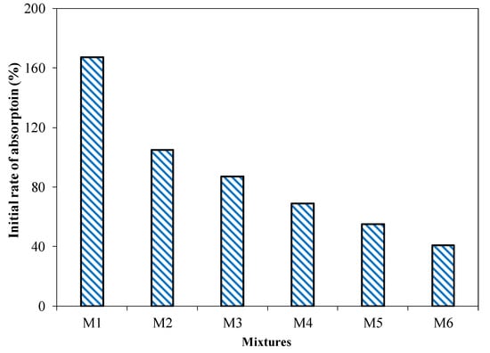 The initial rate of absorption of bricks is one of the important factors for the bond between the bricks and the mortar. This bond between brick and mortar is affected by the water absorption value of bricks and the water-retaining capacity of mortar. The hydration water level for mortar may be reduced with the increased absorption capacity of bricks, leading to a weaker bond between brick and mortar. However, the lower initial rate of absorption (much lower absorption of water by bricks) can cause the mortar bed to float the brick course. Both scenarios will lead to a poor bond between bricks and mortar []. Hence, bricks with a higher initial rate of absorption should be wetted well before utilizing. The initial rate of absorption of brick specimens incorporating different percentages of cement and coal ash are shown in Figure 14. An average of five specimens with a COV of less than 5% at 28 days were reported. It was observed that the initial rate of absorption of the brick specimens increased with the increased amount of coal ash in the coal ash brick specimens. The initial rate of absorption of the brick specimens incorporating 55 to 30% coal ash ranged from 0.47 g/cm2/min to 0.12 g/cm2/min. For instance, a brick specimen incorporating 55% of coal ash showed an initial rate of absorption of 0.47 g/cm2/min in comparison to a brick specimen incorporating 30% coal ash exhibited 0.12 g/cm2/min. This may be attributed to the fact that the increased cement content in the coal ash brick specimen leads to the formation of calcium silicate hydrate, reducing the porosity of the coal ash specimens [,].