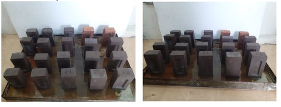 After filling the brick molds with the mixture, a pressure of 3 MPa was applied to each specimen, using an automatic jack system attached to the brick-casting machine. The pressure was applied for 3 s. The bricks were then taken out from their respective molds (Figure 2g) and transported to the curing room (Figure 2h,i). The relative humidity and temperature in the curing room were >95% and 23 °C, respectively. Brick specimens were removed from the curing room after 28 days and underwent various tests.