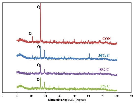 The different phases of chemicals in the brick specimens were investigated via X-ray diffraction analysis. Figure 17 shows the results of XRD for burnt clay and coal ash brick specimens incorporating different quantities of cement. The peaks of quartz (Q) and calcite (C) were identified in both the burnt clay specimens and coal ash-based brick specimens incorporating different cement contents. Minerals such as quartz, anhydrite, and mullite have been identified in previous studies [,,,]. The presence of calcite (C) is also confirmed in the XRD analysis, which was also reported in a previous study [].