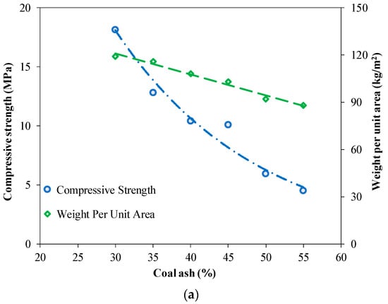 The relationship between the physical and mechanical properties of bricks was established, as shown in Figure 18. Figure 18a depicts the relationship between compressive strength and weight per unit area of bricks incorporating different quantities of coal ash. It is quite evident that the compressive strength decreases with the decrease in weight per unit area, due to the more porous structure of hydrated products at the micro-level []. Similarly, the relationship between compressive strength and the water absorption of bricks incorporating different percentages of coal ash was established, as shown in Figure 18b. It can be seen that the compressive strength of the bricks decreased with an increase in water absorption. The increase in water absorption of the brick specimens due to the increased content of coal ash may be attributed to the hydrophilic nature of coal ash, ultimately leading to a reduction in compressive strength [].