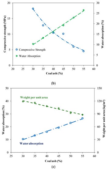 Figure 18c presents the relationship between water absorption and weight per unit area of the brick specimens incorporating different contents of coal ash. An inverse relationship between water absorption and weight per unit area has been observed. It has been suggested that weight per unit area decreases and water absorption increases with the increased content of coal ash. The results presented in Figure 18 showed that a coal ash content of up to 45% is in the allowable range, in accordance with ASTM C62 limits.