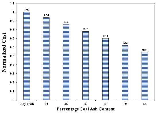 The commercial utilization and choice of coal ash bricks in the construction industry are mainly dependent on their cost effectiveness, while meeting the criteria of ASTM and building codes. Hence, the cost of manufactured coal ash bricks was calculated using the market rate system (MRS) of Punjab [] for the mixtures mentioned in Table 2. The market rate for cement was 610 Pakistani rupees (PKR) (USD 3.2) for one bag (50 kg) and the rate for sand was PKR 40 (USD 0.21) per cubic ft. Meanwhile, the cost of coal ash was PKR 4000 (USD 21) for one thousand kg (1 ton). The cost of electrical energy per brick is PKR 0.45 (USD 0.002). The availability of local materials at cheaper rates leads to obvious economic benefits. The validation of the cost analysis was also verified by the recent research works published by another researcher []. Hence, the normalized cost for different coal ash bricks is shown in Figure 19. Results revealed that the cost of manufacturing the bricks was reduced with the increased amount of coal ash content. For instance, about 30% of the cost can be reduced by utilizing 45% coal ash in the production of bricks meeting ASTM limits and Pakistan Building Code requirements. For coal ash bricks incorporating coal ash from 5% to 55%, the cost varies from 46% to 6%, respectively. Hence, cost analysis suggests that the utilization of coal ash in the production of bricks leads to economical, low-cost, and sustainable building units.