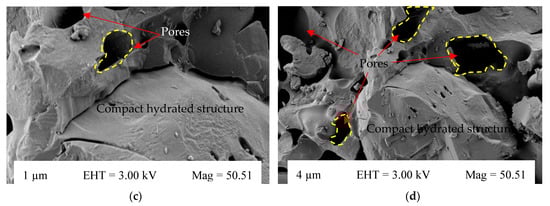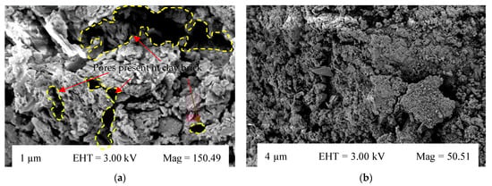 Figure 20a–d shows the high-resolution, magnified scanning electron microscopy (SEM) images of burnt clay bricks and coal ash bricks at different magnifications. It can be observed that the microstructure of bricks incorporating coal ash was porous, which may be attributed to the porous nature of coal ash []. This may be the possible reason for their lesser weight per unit area than conventional burnt clay bricks. Conventional burnt clay bricks showed a comparatively uniform and homogeneous microstructure. Similarly, the bricks incorporating coal ash showed a compacted hydrated structure, along with pores that were irregular and interconnected. These pores that are present in the coal ash brick specimens may be related to the process of crystallization []. The reduction in compressive strength with an increase in coal ash percentage can also be supported by the SEM images. Furthermore, the water absorption and weight per unit area results are also consistent with the microstructural analysis of the brick specimen.