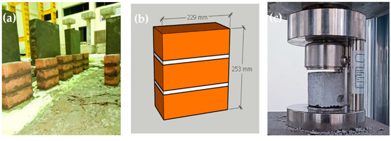 Masonry prism and mortar cubes. (a) Prism specimens during curing; (b) Prism dimensions; (c) Mortar cube compression.