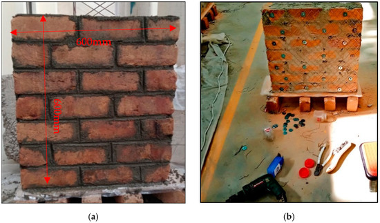 The principal aim of this research is to analyze the seismic performance of strengthened brick masonry. For this purpose, twenty masonry wallets of the same size (600 mm × 600 mm) were constructed in the laboratory according to ASTM E-519, as shown in Figure 2a, and cured for a minimum of 28 days. The same size of specimens has previously been used for testing by other researchers. Locally available materials (cement, sand, solid clay bricks) and artisans were used, as the intention was to represent the typical masonry of Pakistan. Single brick wallets of 113 mm were constructed. Five wallets were kept for comparison, and fifteen were strengthened using steel and plastic meshes. Table 1 shows the nomenclature of the strengthening scheme followed in this research.