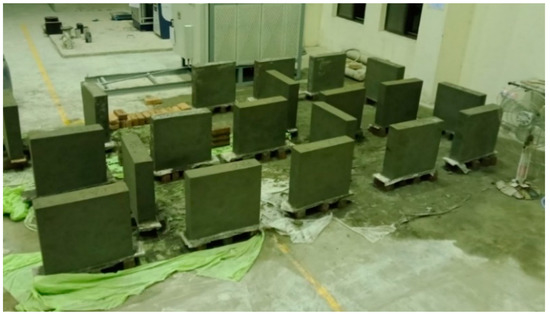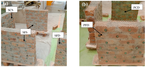 As shown in Figure 3, The SFS specimen were reinforced with steel fine square mesh. Similarly, the SCS was reinforced with steel coarse square mesh. The quantity of reinforcement in the SFS and SCS specimens were almost the same, i.e., 0.73% and 0.74%, respectively, as listed in Table 1. The SFD specimens were strengthened using steel fine diagonal mesh, PCD specimens were reinforced with plastic coarse diagonal mesh, and PFD specimens were reinforced with plastic fine diagonal mesh. All specimens were strengthened symmetrically with the same vertical and horizontal reinforcement and along both front and back surfaces. The wallets were plastered with N-type mortar and then cured, as shown in Figure 4.