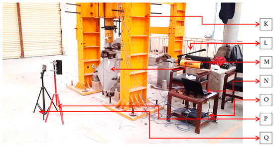 Diagonal tension (shear) testing setup: (K) shear frame (100-ton axial capacity); (L) hydraulic pump; (M) masonry wallet (test sample); (N) laptop for data reading and recording; (O) data logger; (P) lamp; (Q) video recording equipment.