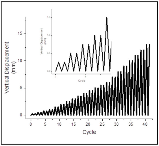 The test setup and loading system is shown in Figure 5 and Figure 6. The masonry wallets were tested in the Structure Dynamics Lab at the Military College of Engineering, Risalpur, Pakistan. Loading shoes were prepared as per the instructions in the ASTM-E519. Initially, the loading shoe was leveled on the ground, then filled with plastic-state gypsum. Prior to the initial setting of the gypsum, the wallets were placed and leveled. The same procedure was performed for both top and bottom loading shoes. Gypsum capping was provided in order to avoid local crushing of the wallet at the point of load application. The wallets with loading shoes were then manually dragged to the loading frame, aligned, and leveled to the hydraulic jack. The test assembly was prepared as per the ASTM-E519, with the load applied on the top shoe of the diagonally placed masonry wallet. This standard provides an approach to finding the shear stress from the diagonal compression using Equations (1)–(5), and ensures that the stresses along the compression diagonal are pure shear. In order to find the shear performance of the reinforced wallets under seismic conditions, cyclic loading was applied at the top loading shoe. Cyclic loading is reversal loading which degrades the structure with each cycle, and the damage is irreversible in the form of stored deformation. Such cyclic loading is applied in order to assess the seismic performance of structures. The data from the cyclic loading test can be used to find important seismic design-related parameters, such as energy dissipation, ductility, and stiffness degradation. [32]. The test was performed according to the cyclic loading protocols shown in Figure 7. The same (unidirectional) cyclic loading protocol has been previously used by Almeida et al. [33] and Dong et al. [34]. Up to 1 mm total vertical deformation, the loading increment was 0.25 mm. After a 1 mm vertical deformation, the increment becomes 0.5 mm. Then, after 5 mm of total vertical deformation, the increment is 1 mm. Each set of loading cycles was applied twice.