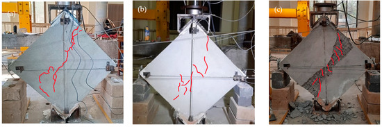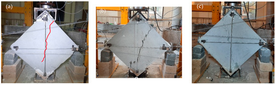 The Steel Fine Diagonal (SFD) specimens showed less ductile behavior compared to the SFS and SCS specimens, although they were able to take the highest load of all the wallets at 139 KN. The initial crack patterns are shown in Figure 13a–c. Breakage of the mesh wires was observed at the peak load, and the load capacity dropped suddenly. The peak stress was 1.4 MPa with a strain of 0.346%. Many of the mesh wires were already broken before reaching the ultimate stress point of 1.15 MPa, corresponding to 0.63% strain. The mesh wires are diagonal, and the specimens were tested in a diagonal position; therefore, the wire was parallel to the stress direction. The anchor nodes transfer all the stresses to the mesh, and when the load exceeds the mesh capacity, the wire begins to break. Therefore, these specimens do not show effective post-peak behavior.