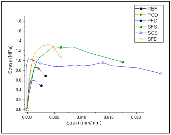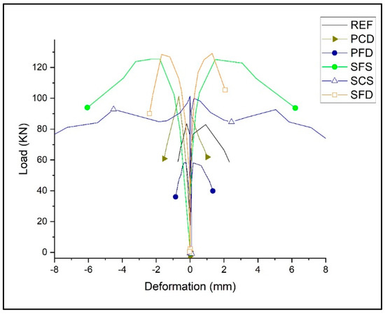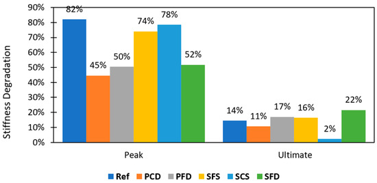 KP and Ku are used to calculate the stiffness degradation and are the slopes of lines passing through the origin, peak (KP), and ultimate point (Ku), respectively. The stiffness degradation was calculated for all the specimens. The average values are shown in Figure 18. The REF showed the highest stiffness degradation at the peak at 82%; SCS was high as well at 78%, followed by SFS and SFD at 74% and 52%, respectively. While SCS had a high value at the peak point, it showed the lowest stiffness degradation at the ultimate stage, at only 2%. This low stiffness degradation of SCS at the ultimate stage shows its significance with respect this parameter.
