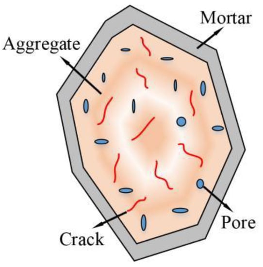 Research results show that RCAs are damaged during the production process, which produces numerous microcracks inside them []. Simultaneously, RCAs feature more edges and corners than NCAs, and hardened cement mortar can become attached to their surfaces, as shown in Figure 1. Because of these factors, RCAs have higher porosity and water absorption than NCAs, and their physical properties are poor []. To improve the mechanical properties of recycled aggregate concrete (RAC), scholars usually use concrete-modification technology. These modification techniques mainly include removing the cement mortar on the surface of the RCA (physical method) [,,], filling the pores and cracks inside the RCA with chemical solutions (chemical method) [,,], and doping fibers to improve the pore structure of the interface transition zone (ITZ) [,,]. Compared with the complicated operation process of physical and chemical methods, the method of doping fibers is more convenient.