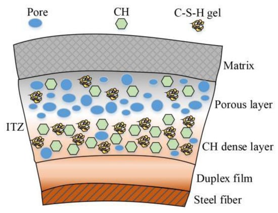 In engineering practice, commonly used fibers are steel fiber (SF) [], polypropylene fiber [], copper fiber [] and basalt fiber []. Because SFs can improve and inhibit the development of concrete cracks, improve the quality of RAC, and at the same time, steel fibers can be mass-produced and cheap, the research and application of steel fiber-reinforced concrete has developed rapidly in recent years []. According to Bentur, the mechanical properties of steel fiber-reinforced concrete is primarily determined by the bonding properties between the SFs and cement matrix []. The ITZ is a weak zone between the SF surfaces and the concrete matrix, as shown in Figure 2. The porosity of the ITZ is relatively high, and its width is approximately 40 µm. The pullout process of the SFs in the matrix is the relative slipping of the SFs caused by the destruction of the structure of the ITZ. Hannawi believes that the SFs have a more hydrophilic surface, and the surrounding cement paste will hydrate and fill the space between the SF and the cement matrix, making its interface transition zone more compact []. However, the research on SFRRCs mainly focuses on the macromechanical properties, which are mainly qualitative descriptions. SFRRC is a porous material whose pore structure determines the macromechanical properties. The relationship between the macromechanical properties of SFRRC and the microscopic pore structure has not been discussed in detail, which requires further quantitative research.