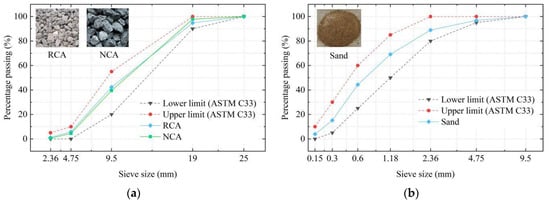 The coarse aggregates (RCAs and NCAs) used in this study were purchased from Shaanxi Hong Wei Ecological Environmental Protection Technology Co., Ltd. (Xi’an, China), and the fine aggregates were natural river sand from Xi’an, Shaanxi Province. Among them, RCAs mainly come from the waste concrete blocks generated from the demolition of old buildings (20–30 years old) in Xi’an city, the strength of these concrete blocks is about C20 to C40, and the adhered mortar content of RCAs is in the range of 40–45%. The size ranges of the coarse and fine aggregates were 5–20 mm and 0–5 mm, respectively, and the particle dimension distributions of the aggregates are shown in Figure 3. It can be seen that the aggregates satisfied the ASTM-C33 [] limit requirements. The primary physical properties of the employed RCAs, NCAs, and sand were tested in accordance with the Chinese code GB/T14685-2011 []; these are listed in Table 1. The results show that the density of the RCAs is lower than those of the NCAs and that the crushing index and water absorption are higher than those of the NCAs; this is related to the adhesion of the old bonding mortar to the surface of the RCAs and the internal microcracks.