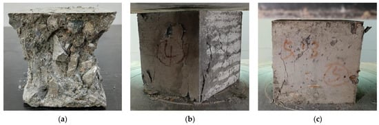 Failure modes in cubic compressive tests: (a) vsf = 0%; (b) vsf = 1%; (c) vsf = 2%.