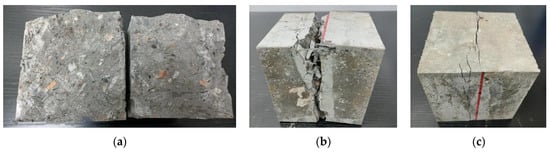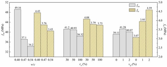 Loads are applied to the specimens by a pressure-testing machine, and the fcu, fts, fc, and Ec of each group of specimens are obtained, as summarized in Table 6. The values in Table 6 are the averages of the test results of three specimens in each group.