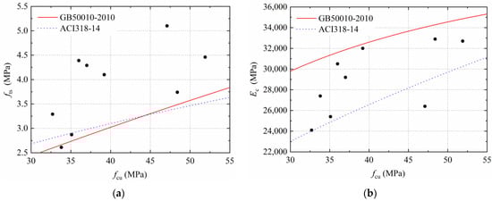 Tensile strength is an important property for reflecting the cracking resistance of concrete, and most scholars advocate the use of splitting tensile tests of cylinders or cubes to indirectly determine the tensile strength of concrete []. Elastic modulus (Ec) reflects the relationship between the stress and deformation of a material in elastic state, and it is a necessary parameter for calculating deformation in concrete structure design []. The results of numerous studies have shown that there is a relationship between the fts, Ec, and fcu of concrete [,]. In this study, fts and Ec are evaluated according to Chinese code GB50010-2010 [] as follows: