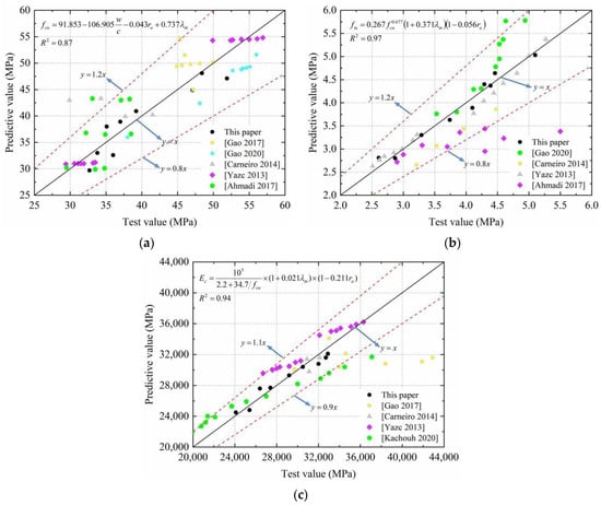 The formulas for the fcu, fts, and Ec of SFRRCs were established by regression analysis. As expected, Figure 14 shows that the fitting coefficients are sufficient for satisfying the requirement. To verify the reliability of Equations (7)–(9), the data of Gao [,], Carneiro [], Yazc [], Ahmadi [], and Kachouh [] were used to compare the calculation results of the formula with the test results. The results are listed in Table 7. It can be found that the predicted values are very close to the actual values. The maximum error of fcu and fts is approximately 20%, the average error is approximately 5%, the maximum error of Ec is approximately 10%, and the average error is approximately 2%. Consequently, the modified formulas can be applied to predict the fcu, fts, and Ec of SFRRCs with satisfactory accuracy.