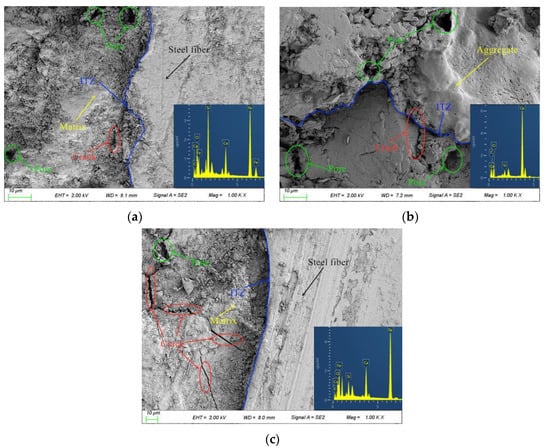 From Figure 15a, it can be found that there is a microcrack between the SFs and the cement matrix. The SFs are pulled out from the cement matrix mainly because the ITZ structure is damaged, which eventually leads to the relative sliding of the SFs and the matrix. From Figure 15b,c, it can be found that the holes and cracks near the ITZ are significantly reduced at 1% SF doping compared to that in the specimens without SFs. However, the number and size of the cracks near the ITZ increases significantly when the SF dosing is 2%.