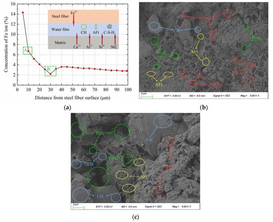 It can be seen that, as the distance from the surfaces of the SFs increases, the concentration of Fe2+ ions first decreases and subsequently increases. At 25–35 µm from the surfaces of the SFs, the Fe2+ ion concentration is close to the lowest value. After 40 µm, the Fe2+ ion concentration begins to level off, and at 100 µm, it is the inherent Fe2+ ion concentration of the cement itself. The results show that a part of the Fe2+ ions can be dissolved from the surfaces of the SFs, which is different from an ordinary aggregate interface. This part of the Fe2+ ions enters the water film, and the superposition of the ions dissolved in the cement and the ions dissolved from the SFs makes the concentration of ions in the interface higher than that in the ordinary aggregate interface. Fe2+ ions can reduce some of the adverse effects of the water film, and more CSH is formed close to the SFs. This increases the probability of the CSH contacting the SFs and causes it to fill the porous structure close to the surface of the SFs, therefore enhancing the compactness of the structure. The Fe2+ ion concentration is lower in the A area slightly further from the fiber surface, and the needle-shaped AFt and hexagonal-shaped CH mainly accumulated in the area. Owing to the influence of solid particle shape, the sparse accumulation of particles around the side wall produces numerous pores, resulting in the formation of a loose structure in the ITZ around the aggregates, which can be considered to be a weaker area in the SF–matrix. However, excessive SFs can have a detrimental effect on the concrete, which requires a more detailed analysis of the microscopic pore structure parameters.