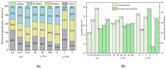 The microscopic pore structures of the SFRRCs were determined using the MIP method, and the pore structure parameters of each specimen are listed in Table 8 and shown in Figure 17. The pore structures can be divided into four levels according to the pore size []: harmless pores (diameter < 20 nm), less-harmful pores (diameter 20–50 nm), harmful pores (diameter 50–200 nm), and more-harmful pores (diameter > 200 nm).