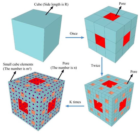 The static pore structure of concrete as a porous medium is generally analyzed using the Menger sponge model, and this method has been recognized by many researchers []. As shown in Figure 18, each side of the initial element with side length R is equally divided into m parts, following which m3-small cube elements are obtained and n small cube elements are randomly eliminated. After k times, the number of remaining cubes is (m3 − n)k and the side length of the smallest cube unit is rk = R/mk. The fractal dimension, Dm, of the sponge model is calculated using the box-counting method, as expressed below: