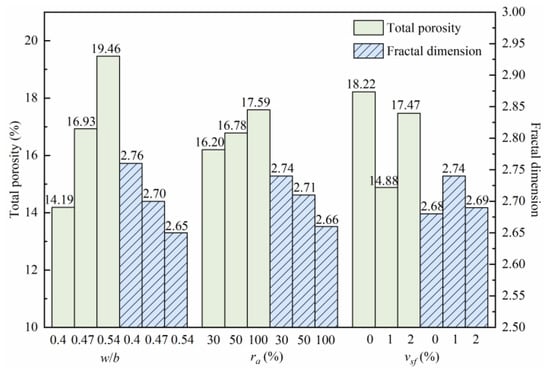 It can be seen from Figure 19 that the variation law of the total porosity of the SFRRCs is opposite to the variation law of the fractal dimension, which indicates that porosity can reflect the variations in the pore structure composition and distribution in the concrete to a certain extent. A large fractal dimension implies a highly complex pore structure and high composition in the concrete, and a high tortuosity of the capillary pores.