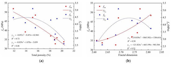 Fitting of SFRRC strength and pore characteristic parameters: (a) Total porosity fitting curve; (b) Fractal dimension fitting curve.