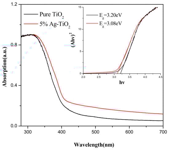 - Loading Ag on TiO2 did not change the microscopic morphology and crystal structure of TiO2, but it could improve the absorbance of TiO2 in the visible region and reduce the forbidden bandwidth.