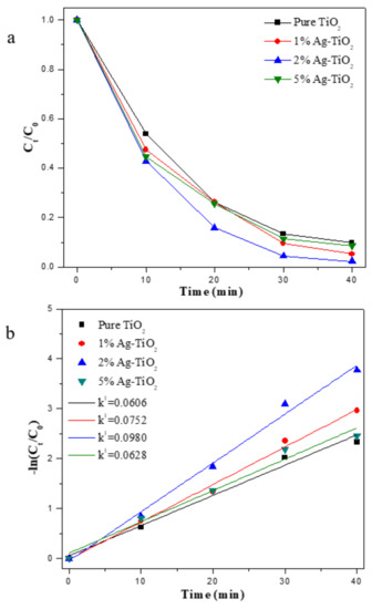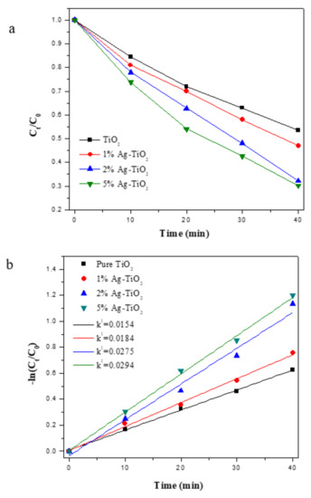 - Mogal, S.I.; Gandhi, V.G.; Mishra, M.; Tripathi, S.; Shripathi, T.; Joshi, P.A.; Shah, D.O. Single-Step Synthesis of Silver-Doped Titanium Dioxide: Influence of Silver on Structural, Textural, and Photocatalytic Properties. Ind. Eng. Chem. Res. 2014, 53, 5749–5758. [Google Scholar] [CrossRef]