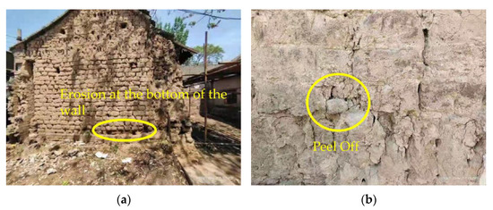 Disease map of cultural-relic buildings in western Henan: (a) erosion at the bottom of the wall; (b) peeling off the wall.