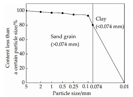 The soil used in the experiment was taken from the rural soil near the site of raw soil and cultural relics in western Henan, and the soil depth was below 20 cm–30 cm to ensure that the various physical properties of the undisturbed soil were from the same type of soil. Geotechnical tests were carried out in accordance with the “Standards for Geotechnical Test Methods” (GB/T50123-2019), and the physical and mechanical properties of the soil samples are shown in Table 1. The particle gradation curve of soil is shown in Figure 3.