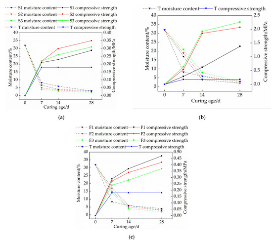 The relationship between the compressive strength and moisture content of each group and the curing age: (a) Single mixed quicklime group; (b) Mono-doped sodium methyl silicate group; (c) Compounding group.