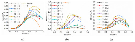 The stress-strain diagram of each group of samples: (a) Single mixed quicklime group; (b) Mono-doped sodium methyl silicate group; (c) Compounding group.