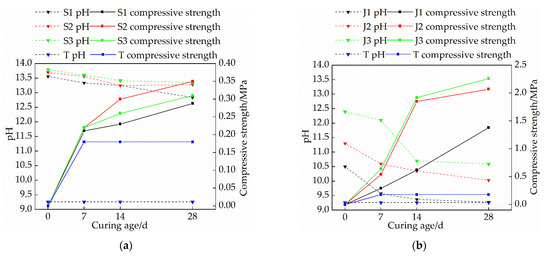 Figure 6a is a graph showing the relationship between the compressive strength and pH of the single-mixed quicklime group and the curing age. As it can be seen from Figure 6a, the pH of the sample increases with the increase of the amount of quicklime; under the same dosage, the pH of the sample decreases with the increase of curing age; the compressive strength of the sample increases with the decrease of pH; thus, the greater the pH drop, the faster the compressive strength increase. From the change in the pH, it is evident that the pH value decreased rapidly from 0 to 14 days, and then the decreasing rate became subtle. This is because when the curing age is short, the water content in the sample is higher. After the CO2 gas in the air enters the sample, it quickly dissolves in water to form carbonic acid. The pH of the samples decreased rapidly. With the increase of the curing age, the moisture content inside the sample decreases, and the amount of carbonic acid formed by CO2 in the air dissolved in water is also relatively less, resulting in a limited amount of OH− consumed, and thus the rate of the pH decline tends to be gentle. The faster the pH drop, the more calcium carbonate is produced, and the cohesion of calcium carbonate between soil particles makes the modified raw adobe stronger. In comparison, the pH increases with the increase of the content of quicklime because the reaction between quicklime and water is alkaline. However, it is not the case that an increasingly higher dosage leads to a correspondingly faster reaction rate. The addition of a small amount of quicklime has a great influence on the mechanical properties of the modified raw adobe [14]. If the amount of quicklime is too high, too much water will be consumed when OH− is generated, and due to the rapid water loss, the amount of carbonic acid formed with CO2 in the air is relatively limited, and the amount of calcium carbonate provided is relatively small. Therefore, the pH value decreases slowly.