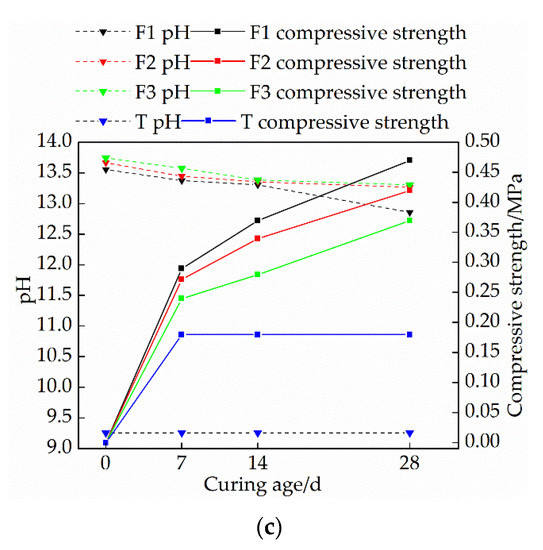 Figure 6c is a graph showing the relationship between the compressive strength and pH of the compounding group and the curing age. Combined with the change of water content in Figure 4c, it is evident that the pH of each compounding group increases with the increase of the amount of quicklime; under the same dosage, the pH of the sample decreases with the increase of the curing age; and the compressive strength of the samples increased with a decreasing pH. The pH of the samples in the F2 and F3 groups decreased rapidly within 14 days and then slowed after 14 days, while the pH value of the samples in the F1 group increased rapidly after 14 days. This is because the reaction of quicklime and sodium methyl silicate in the adobe will consume water. When the amount of quicklime increases, the water in the sample will be quickly lost, resulting in the inability for the next reaction to occur [26]; therefore, the pH decreases slowly. After 7% quicklime was added, there was still more water in the sample at 14 d, which provided the conditions for the next carbonization reaction. Therefore, for the composite sample, the lower the initial pH of the sample, the faster the pH decline with the increase of the curing age, and the higher the strength of the modified raw body.
