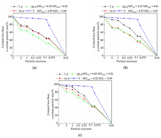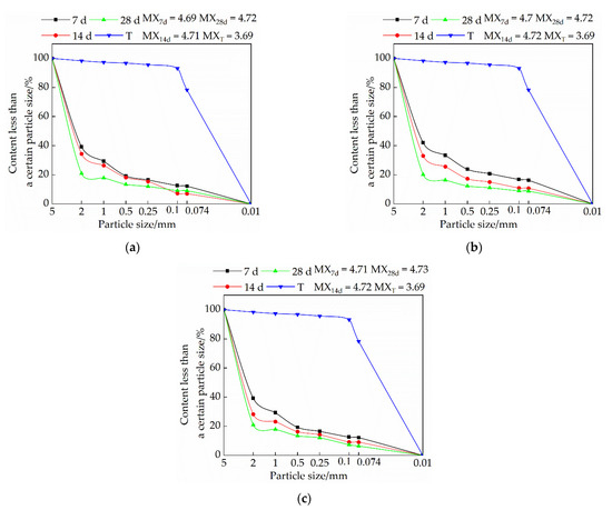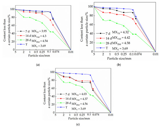 Influence of composite admixture on sample particle size distribution: (a) Particle size distribution of samples in group F1; (b) Particle size distribution of samples in group F2; (c) Particle size distribution of samples in group F3.