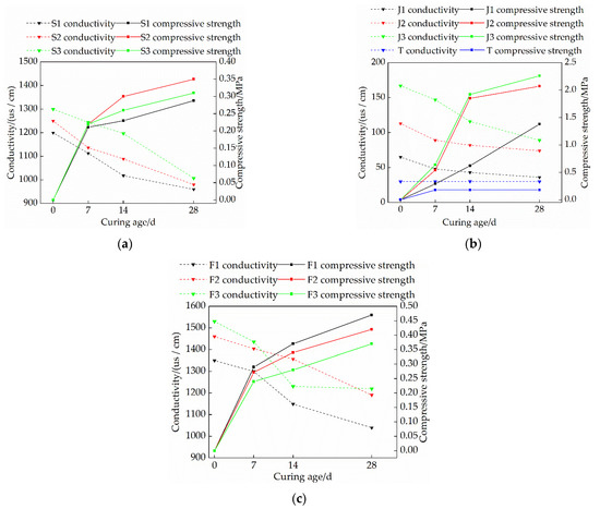 Variation of sample conductivity with curing age: (a) Single lime mixed group; (b) Mono-doped sodium methyl silicate group; (c) Compounding group.