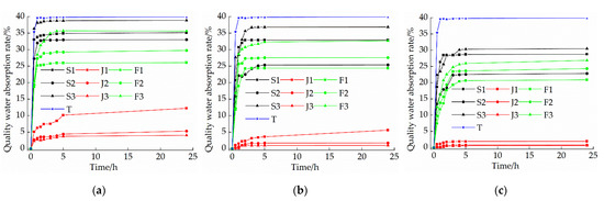 Variation of water absorption rate of sample mass with time under different curing ages: (a) Curing 7 d; (b) Curing 14 d; (c) Curing 28 d.