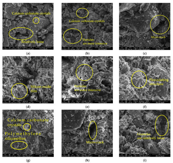 Figure 12g–i are the SEM pictures of the multi-blended group after curing for 28 days. It is evident from Figure 12g–i that with the increase of the lime content, the generated calcium carbonate does increase, but the soil particles are looser, with more micro-cracks and larger pores. After the addition of sodium methyl silicate and lime, there will still be some fine micro-cracks, and the density is not as good as that of the single-doped sodium methyl silicate. According to our analysis, with the increase of the lime content, the lime will consume the water in the adobe causing a carbonization reaction and the release of a lot of heat, and the rapid disappearance of water leads to the generation of micro-cracks [33], thereby reducing the compactness and strength of the adobe. Sodium methyl silicate also consumes water when carbonization occurs, but the polymethylsilyl (C5H12OSi) ether produced by it also plays a role in water retention to a certain extent, which can slow down the rate of water loss in the adobe, thereby reducing the appearance of micro-cracks. The carbides of sodium methyl silicate and lime will have a certain micro-expansion effect. Many of the carbides agglomerate soil particles inside the sample and expand, and the expansion degree is too high, which leads to cracking inside the sample, which affects the strength and water resistance of the sample.