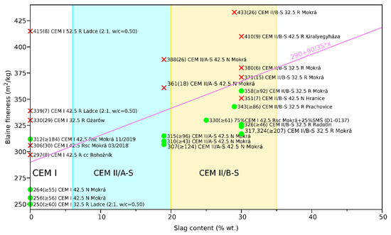 | CEM II/B-S 42.5 N Hranice b | 351 | ∼21 | ∼52 | 134 | |