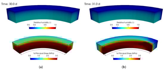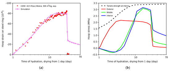 - Šmilauer, V.; Havlásek, P.; Gasch, T.; Delaplace, A.; Bouhjiti, D.E.M.; Benboudjema, F.; Briffaut, M.; Kanavaris, F.; Azenha, M. Hygro-mechanical modeling of restrained ring test: COST TU1404 benchmark. Constr. Build. Mater. 2019, 229, 116543. [Google Scholar] [CrossRef]