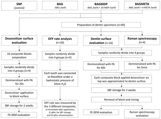 Thus, we prepared experimental dentin desensitizers containing novel BAG to improve the sealing effect and extend the duration of desensitization. The aim of this study was to investigate the effect of novel BAG-containing dentin desensitizers on the dentin permeability through dentinal fluid flow (DFF) rate measurements, field emission scanning electron microscopy (FE-SEM), and Raman spectroscopy. Acidic functional monomers (either 10-MDP or 4-META) were also incorporated into the desensitizers to evaluate the additional effect of desensitizers. The following null hypotheses were evaluated: (1) there would be no difference in dentin permeability owing to the effect of BAG incorporation into the dentin desensitizer; and (2) there would be no differences in dentin permeability with the addition of acidic functional monomers to novel BAG-containing dentin desensitizers.