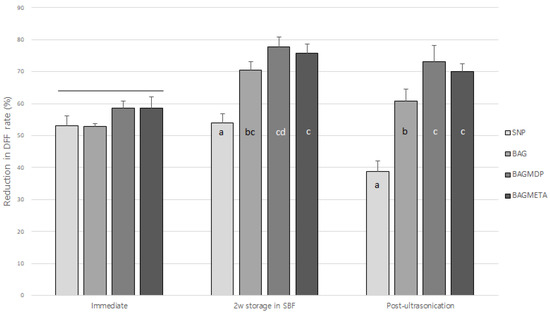 Table 2 and Figure 2 present the DFF rates and ΔDFF for all experimental groups. For the immediate time points, there was no significant difference in ΔDFFImmediate among the four groups (p > 0.05). After two weeks of storage in SBF, the ΔDFF2w storage in SBF of all the experimental groups increased, except for the SNP group (p < 0.05). Ultrasonication decreased the ΔDFFPost-ultrasonication of all the experimental groups compared to ΔDFF2w storage in SBF, except for the BAGMDP group (p < 0.05). Figure 3 shows representative real-time changes in the DFF rate of each group.